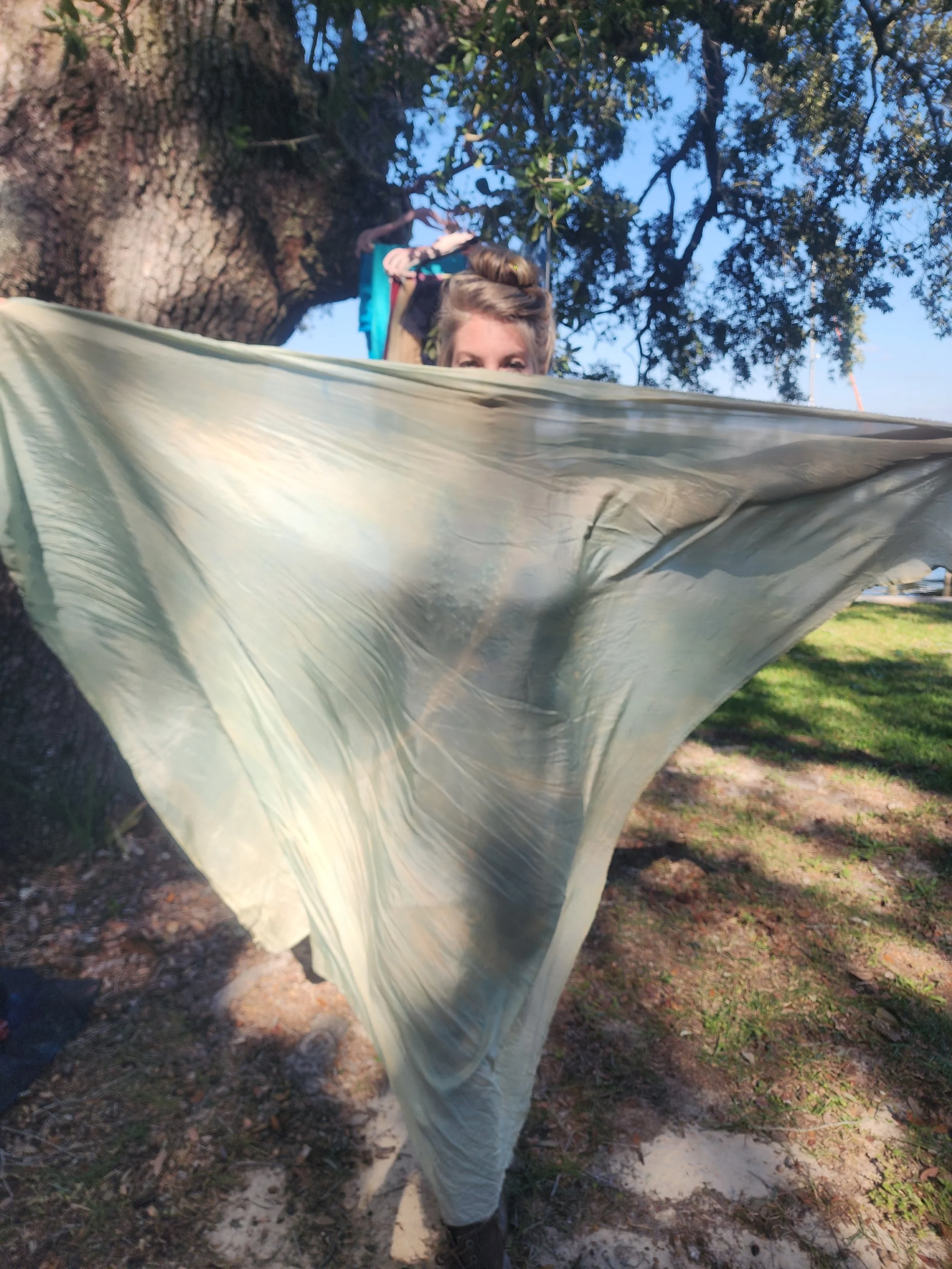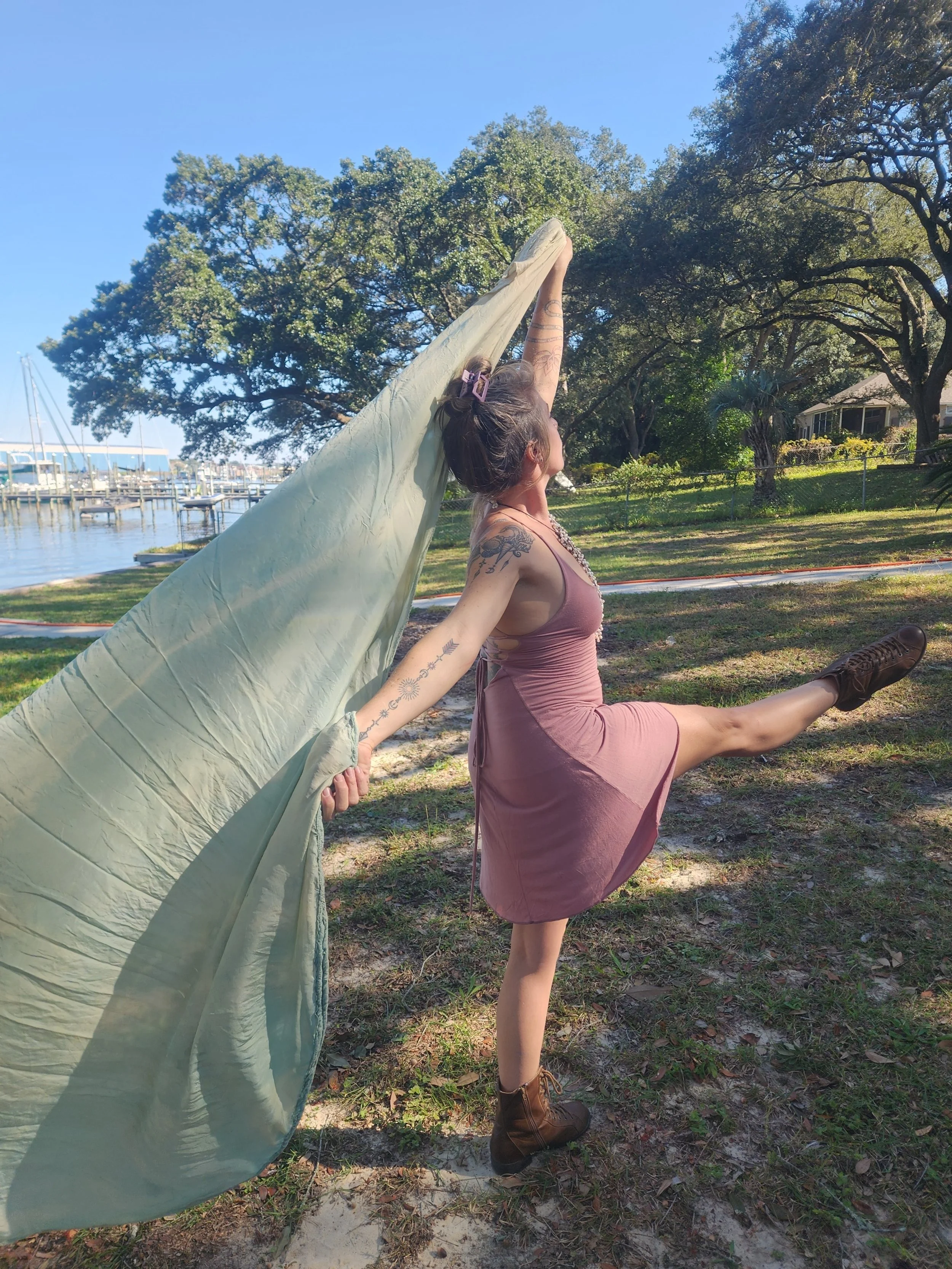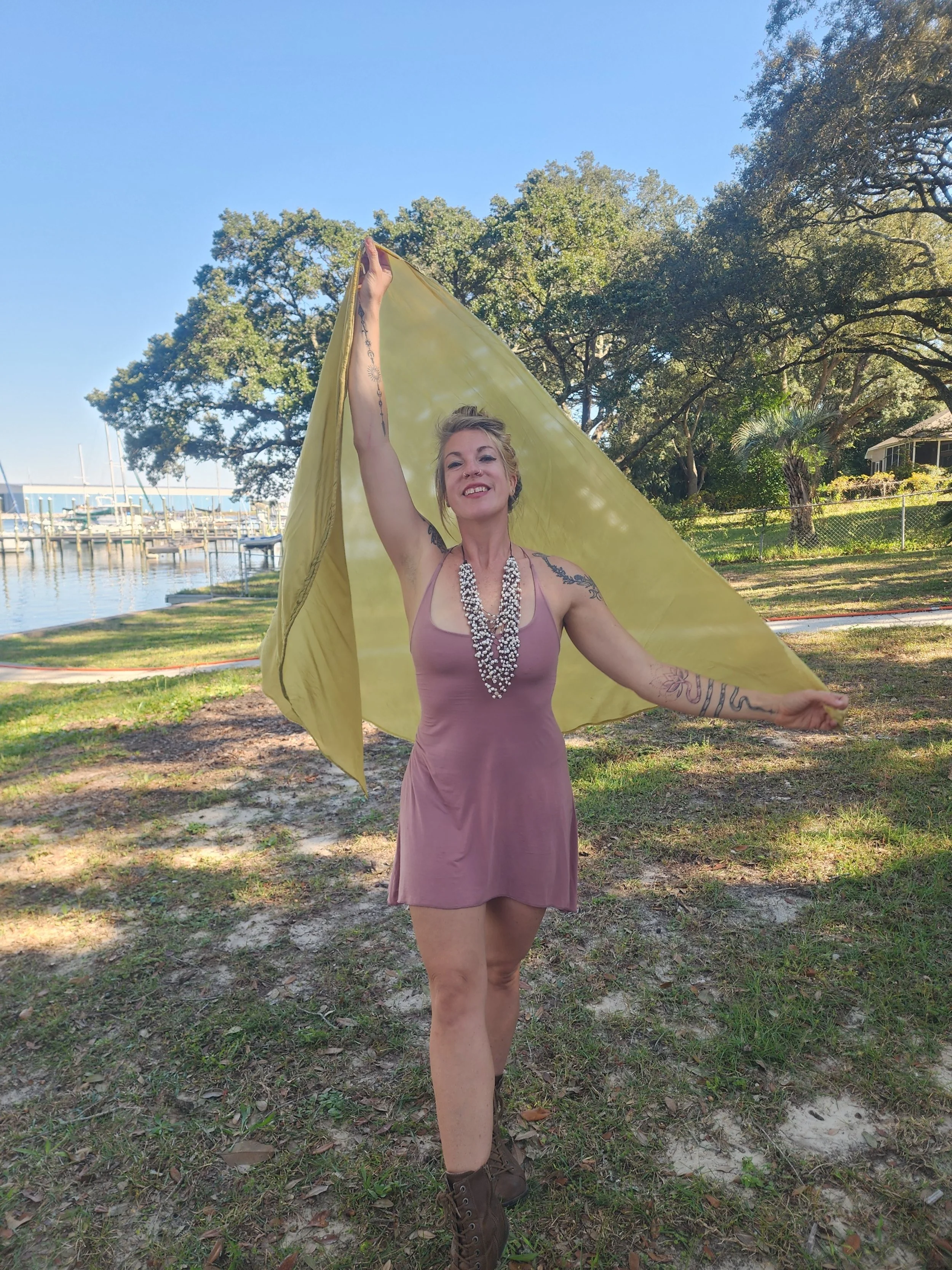 Each weighted silk veil is a unique art piece, created by Gaea Lady (assisted by Laine Bones). This style of ‘flow prop’ is designed to get you out of your head and into your body by enveloping both dancer and viewers in high quality Chinese silk. It is accessible to beginners, yet offers complexity for years and years of devoted explorations & refinement. The weighted edge ‘leads’ the rest of the veil, offering more direction than just a silk veil itself. A whole flow-losophy has emerged out of Gaea’s experience with this prop, and she teaches online via classes & tours sharing it. Versatile: costume, garment, skirt, cape, wrap ; as a decorative element in the home ; and as flow prop that can be used in a myriad of ways. (This design is the product of 10+ years of development and refinement by Gaea herself, please do not replicate without permission! )
