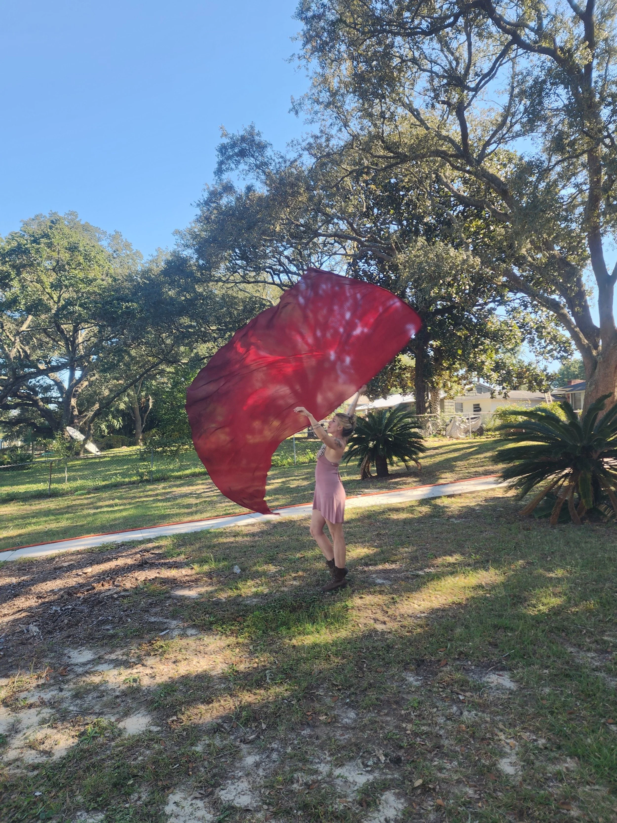 Movement : This large style veil is big enough to wrap most bodies, and flutters sumptuously with the tail diagonal edge in curvaceous shapes that are varied and infinite. Ideal for larger spaces (but can be adapted for smaller with skill) this large shape takes up space! I recommend you move your body a lot when dancing with large veils. The dyed color spot on this veil creates more spiral movement for the eye, making your swirls catching and fetching.