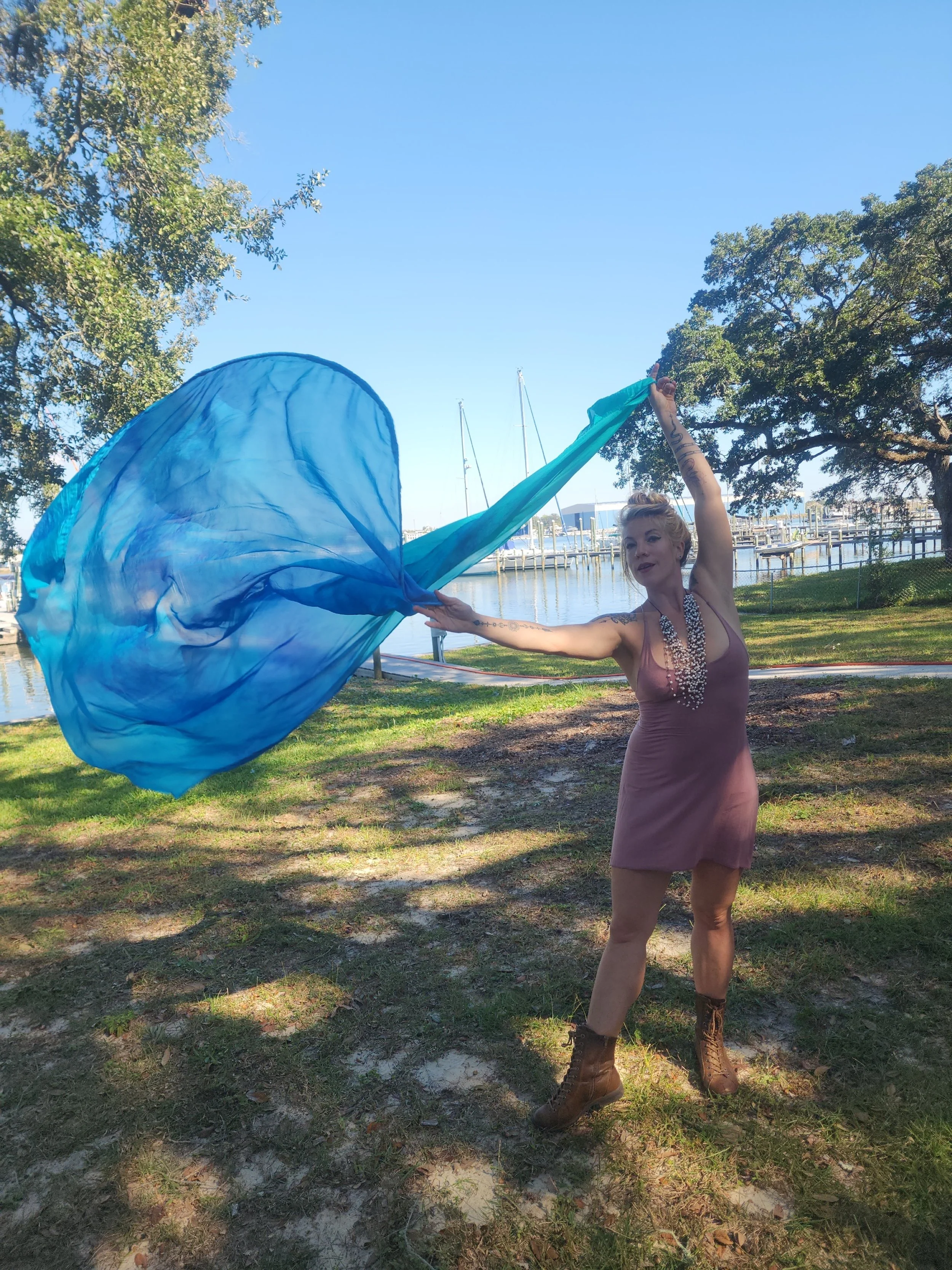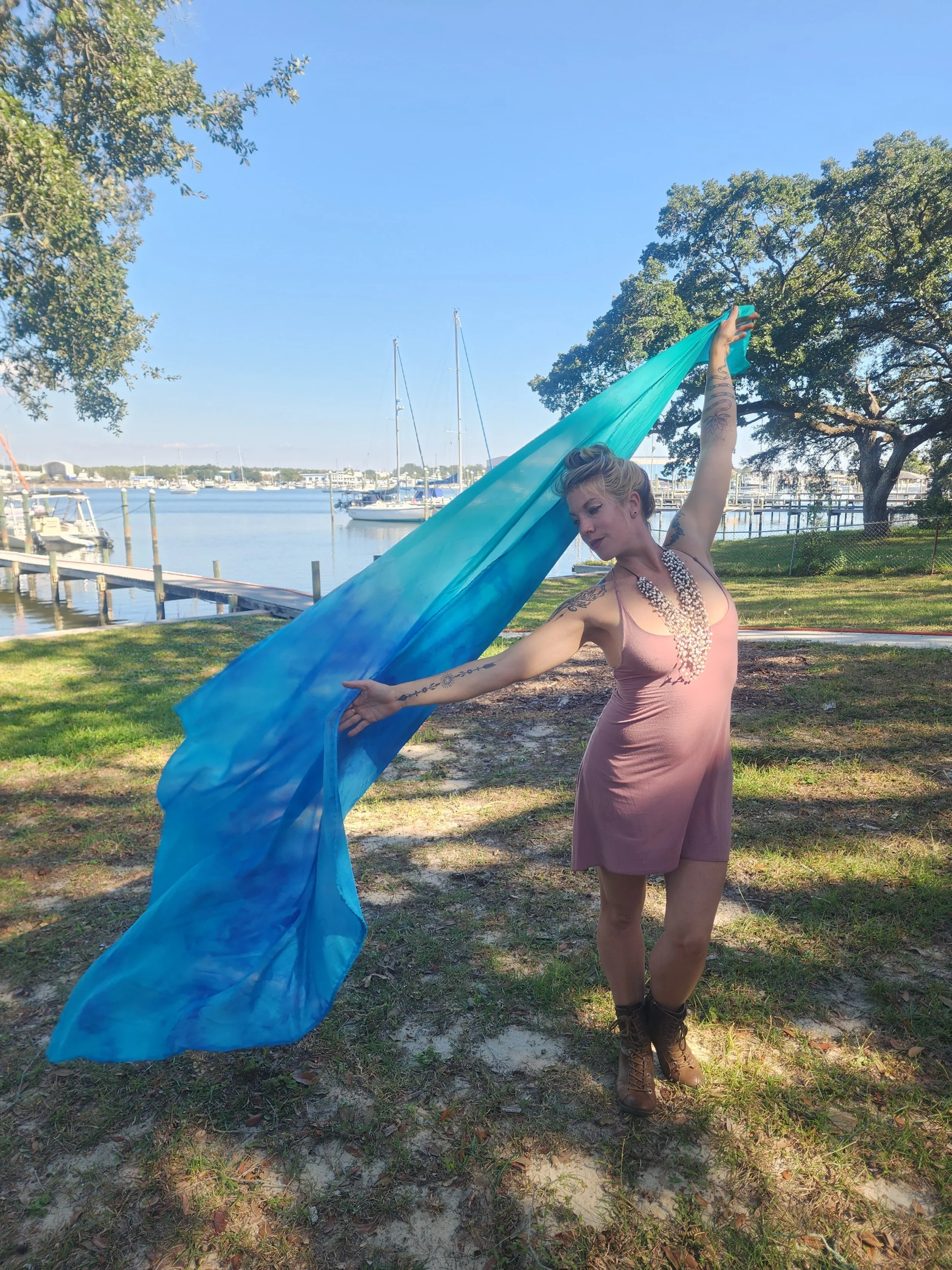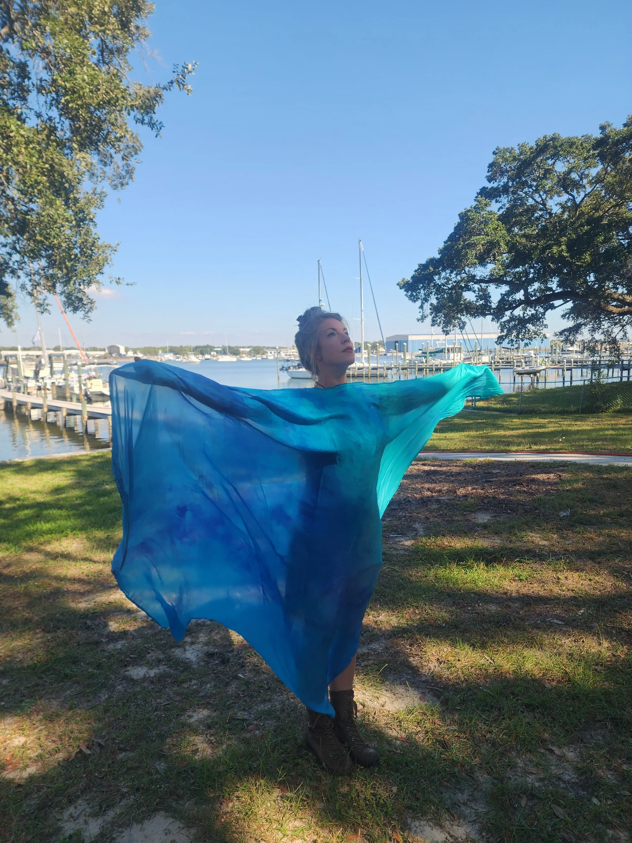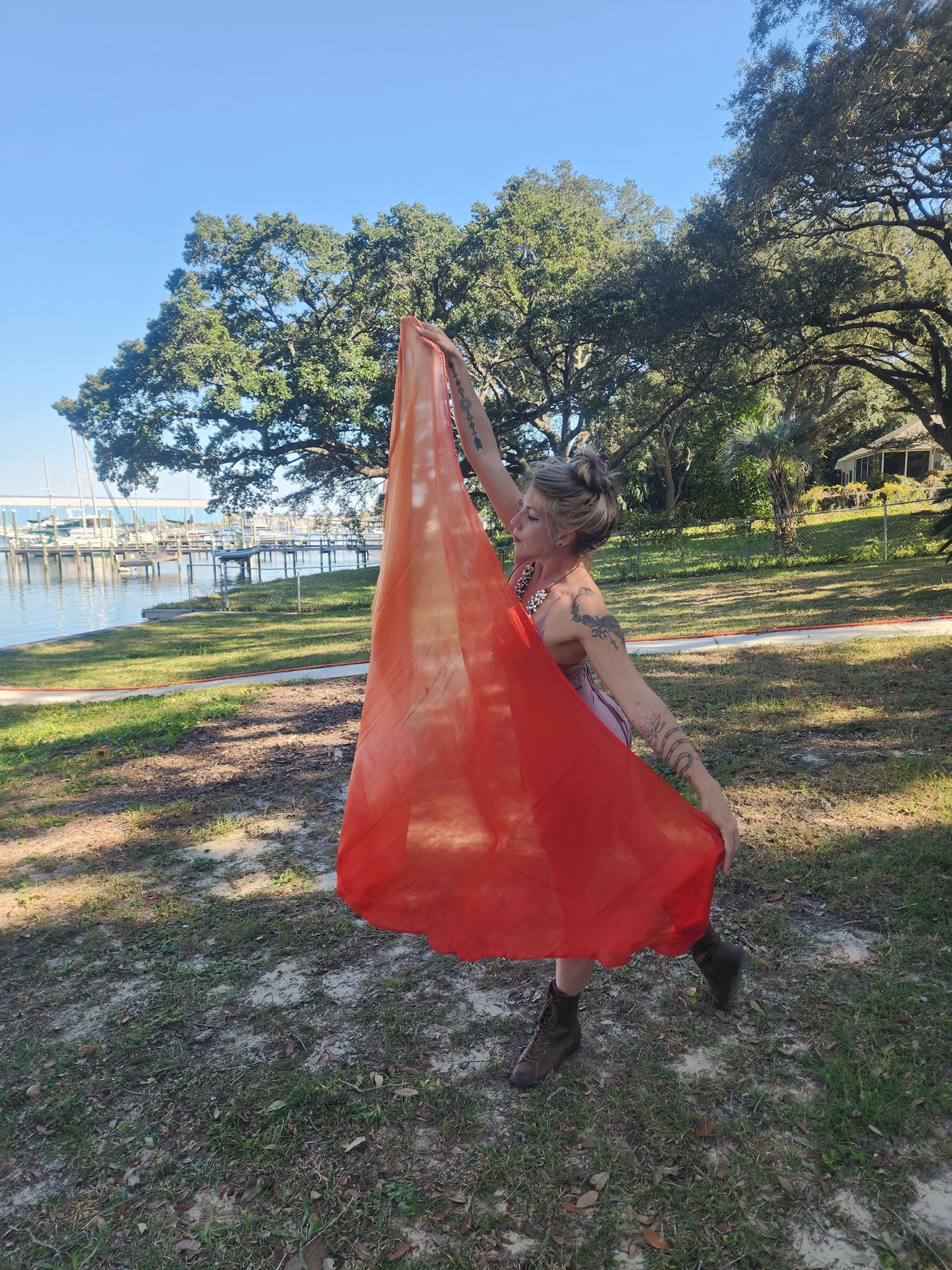 Each weighted silk veil is a unique art piece, created by Gaea Lady (assisted by Laine Bones). This style of ‘flow prop’ is designed to get you out of your head and into your body by enveloping both dancer and viewers in high quality Chinese silk. It is accessible to beginners, yet offers complexity for years and years of devoted explorations & refinement. The weighted edge ‘leads’ the rest of the veil, offering more direction than just a silk veil itself. A whole flow-losophy has emerged out of Gaea’s experience with this prop, and she teaches online via classes & tours sharing it. Versatile: costume, garment, skirt, cape, wrap ; as a decorative element in the home ; and as flow prop that can be used in a myriad of ways. (This design is the product of 10+ years of development and refinement by Gaea herself, please do not replicate without permission! )