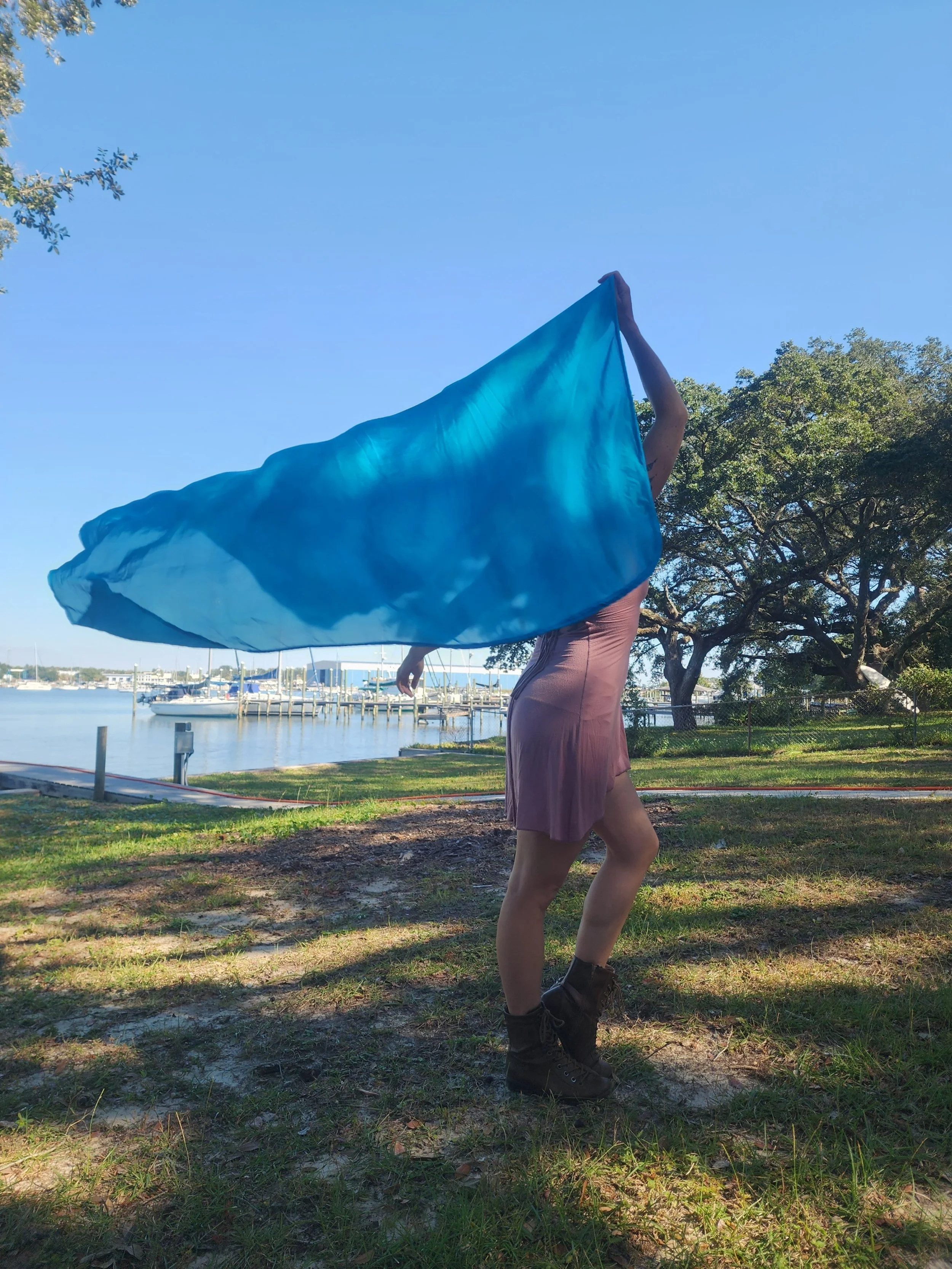 Movement : This large style veil is big enough to wrap most bodies, and flutters sumptuously with the tail diagonal edge in curvaceous shapes that are varied and infinite. Ideal for larger spaces (but can be adapted for smaller with skill) this large shape takes up space! I recommend you move your body a lot when dancing with large veils.