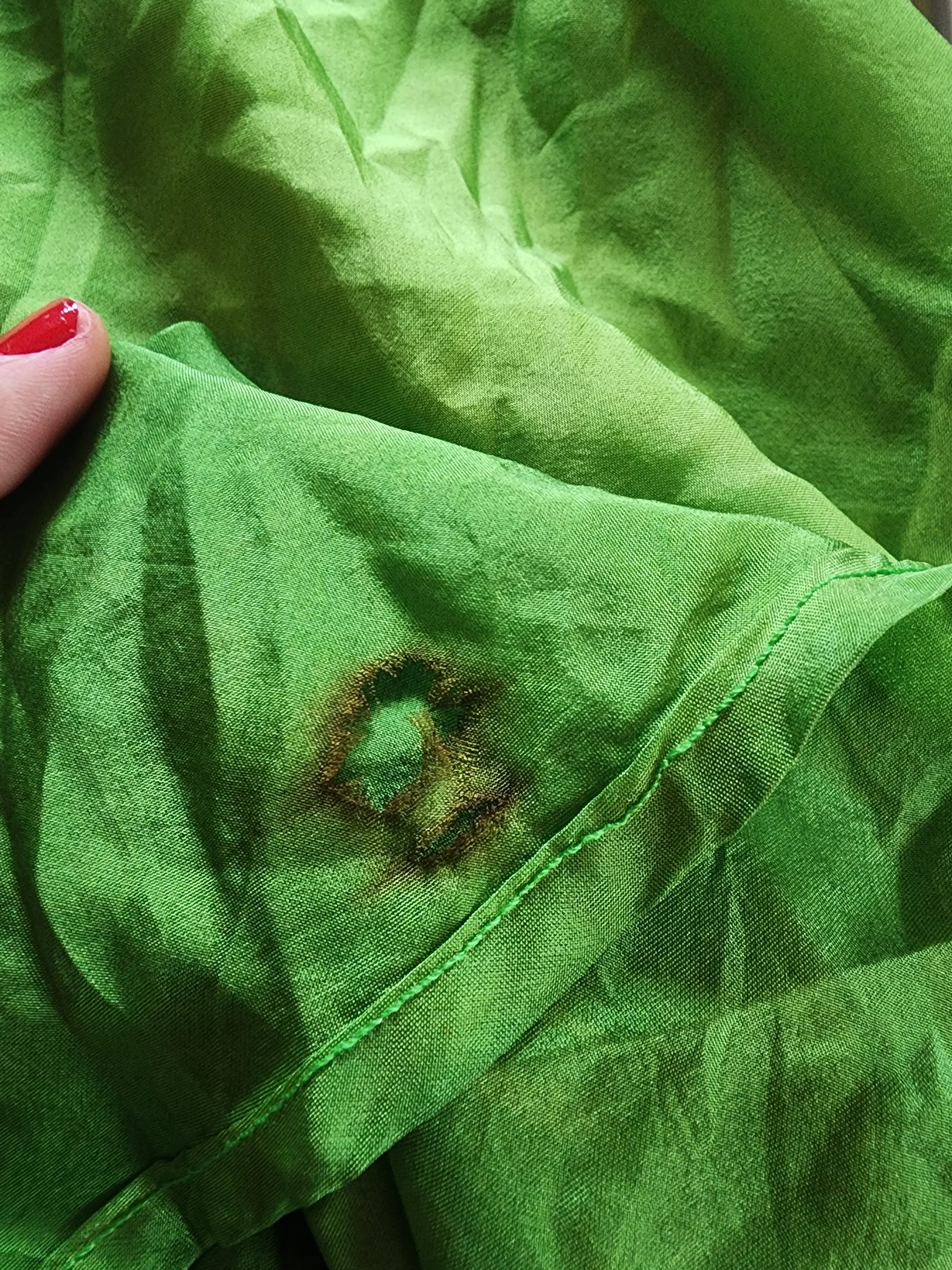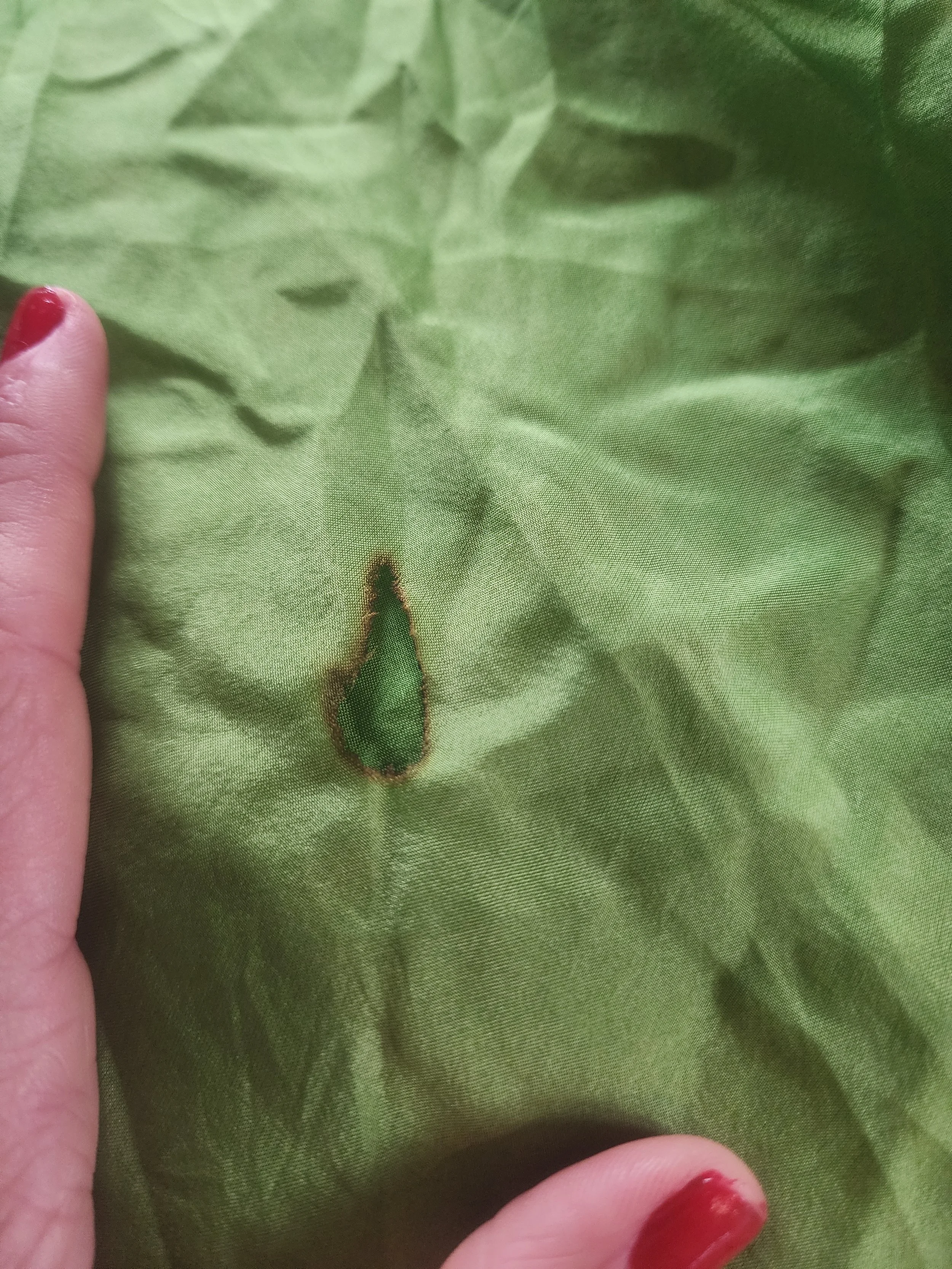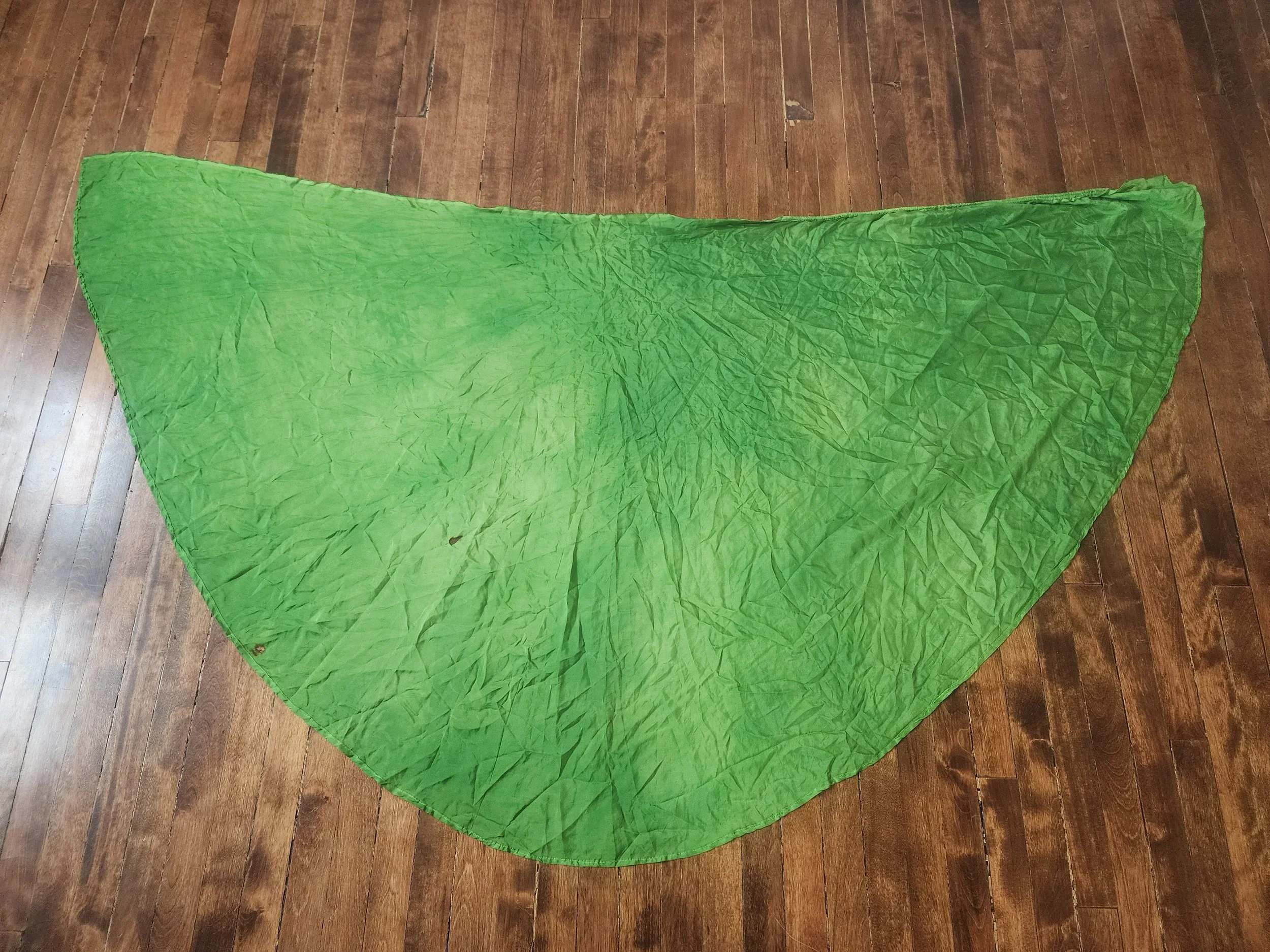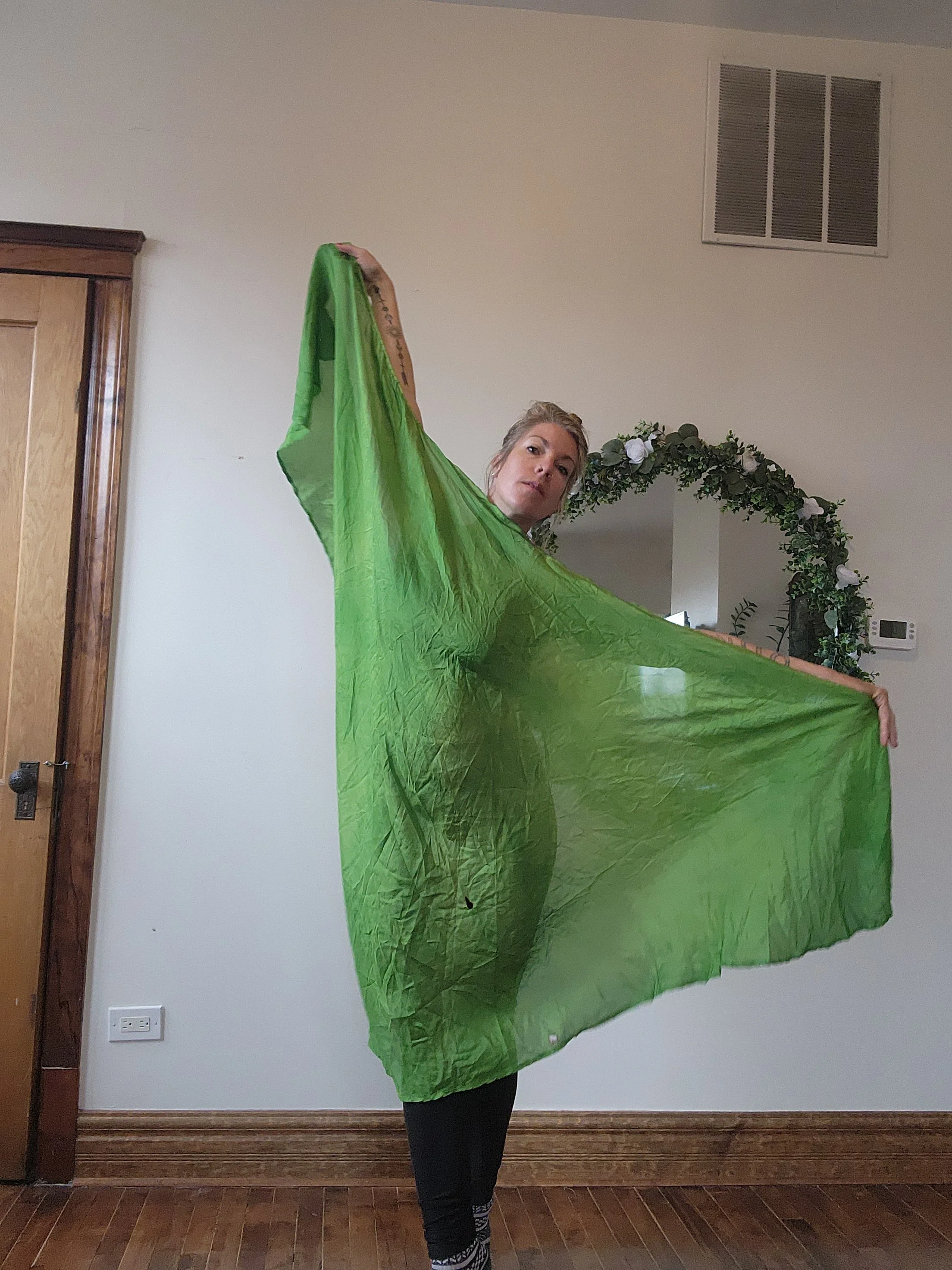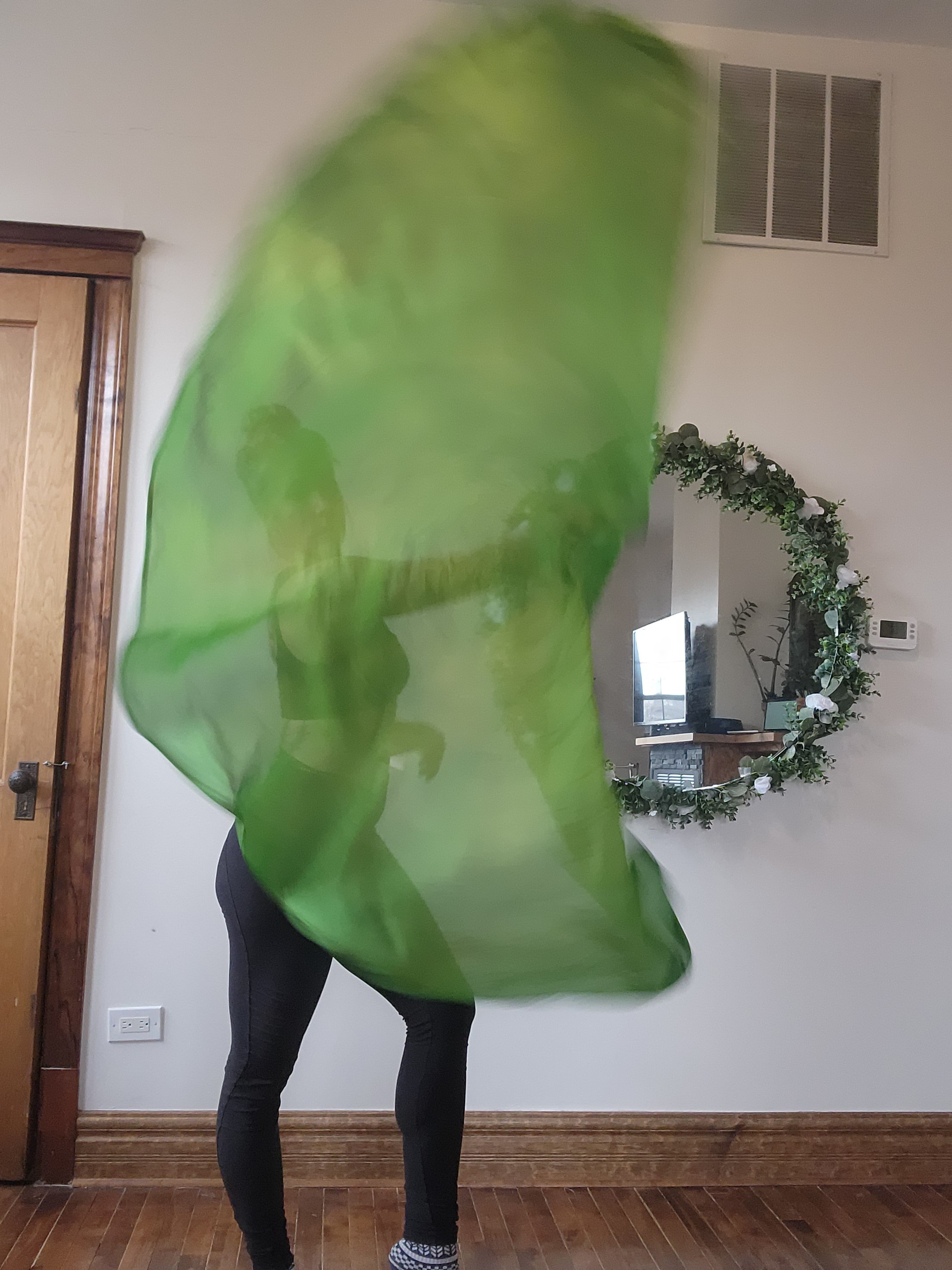 Movement : This large style veil is big enough to wrap most bodies, and flutters sumptuously with the tail diagonal edge in curvaceous shapes that are varied and infinite. Ideal for larger spaces (but can be adapted for smaller with skill) this large shape takes up space! I recommend you move your body a lot when dancing with large veils. [The dyed color spot on this veil creates more spiral movement for the eye, making your swirls catching and fetching.]