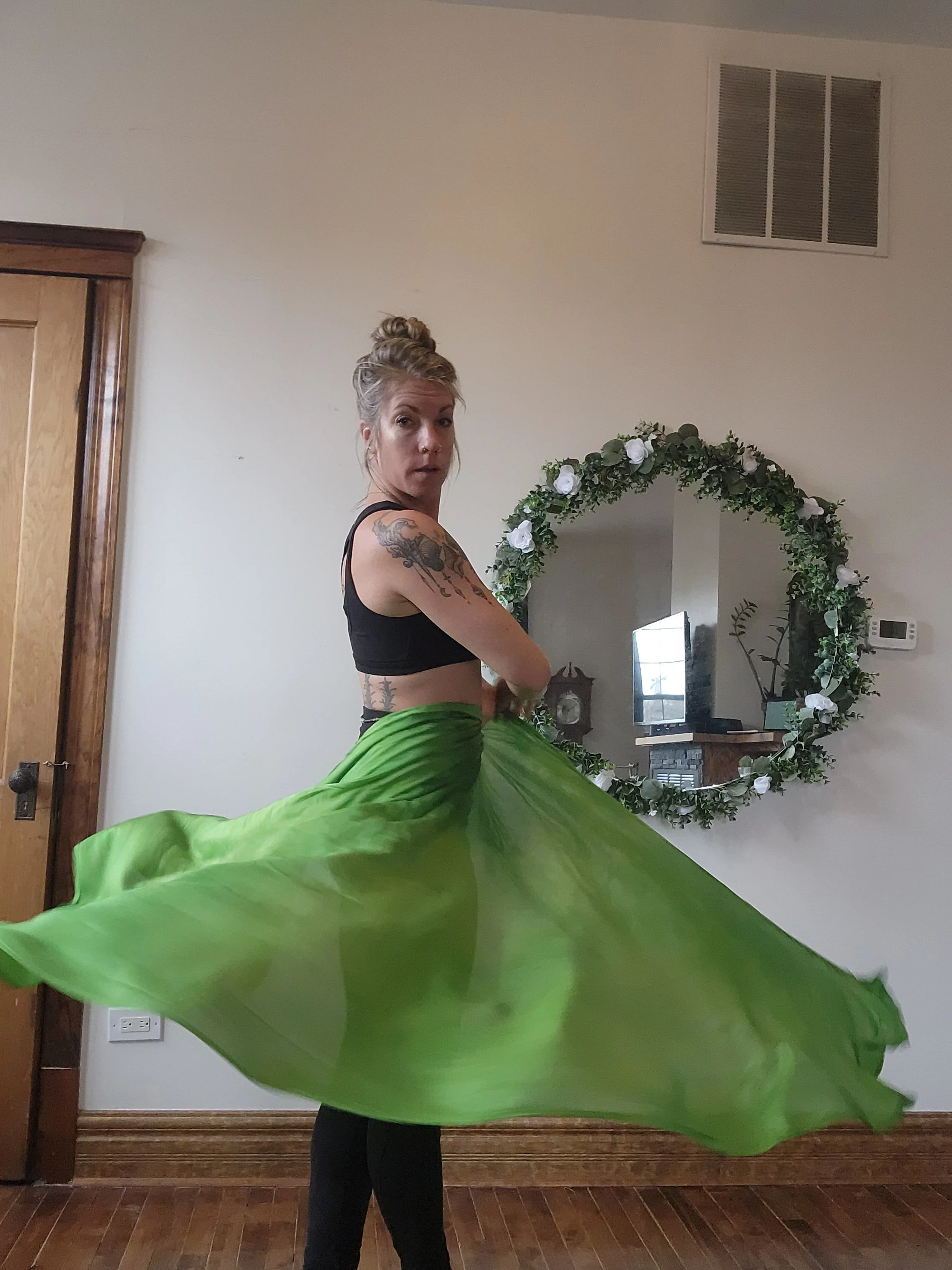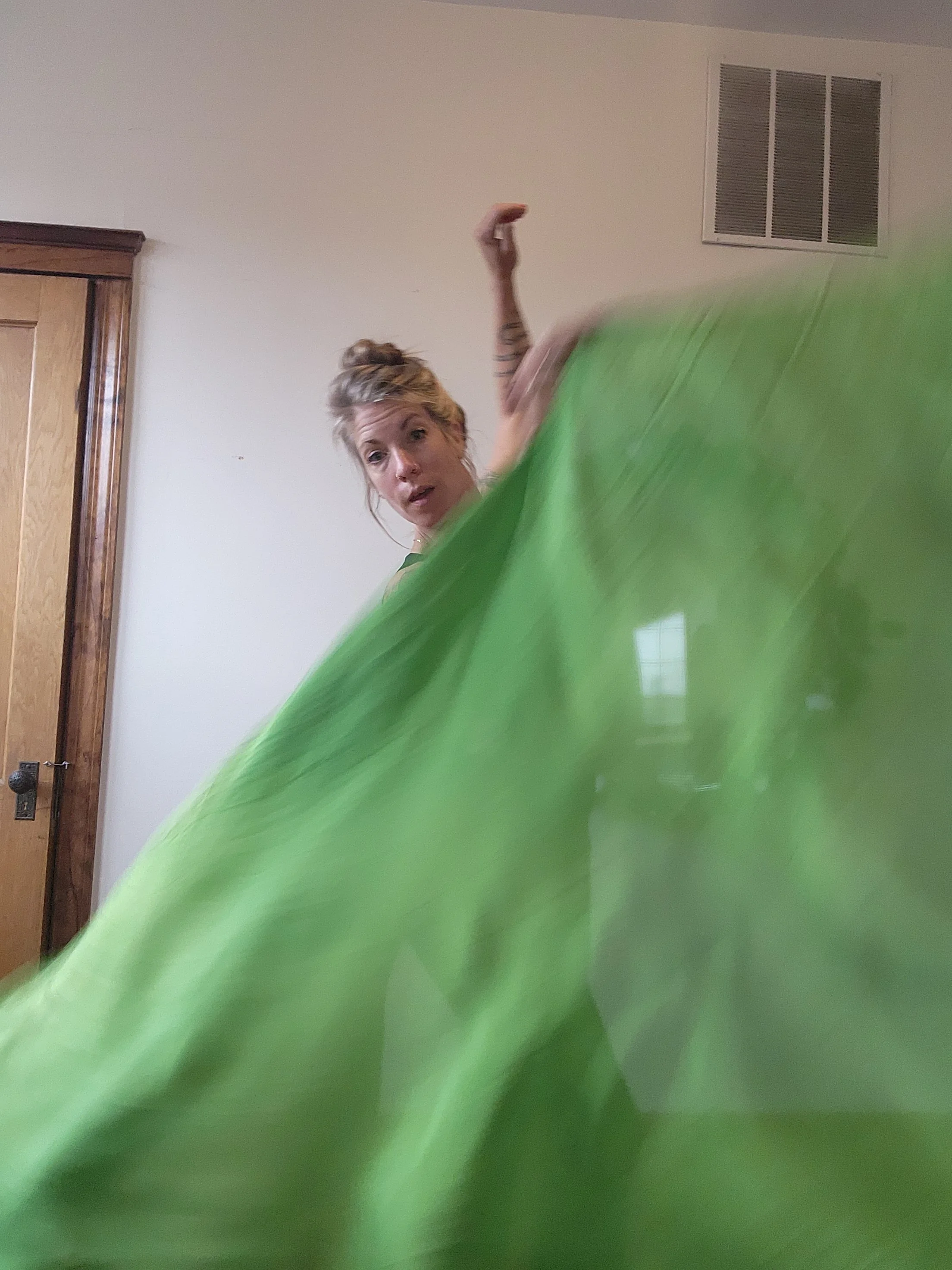 Each weighted silk veil is a unique art piece, created by Gaea Lady (assisted by Laine Bones). This style of ‘flow prop’ is designed to get you out of your head and into your body by enveloping both dancer and viewers in high quality Chinese silk. It is accessible to beginners, yet offers complexity for years and years of devoted explorations & refinement. The weighted edge ‘leads’ the rest of the veil, offering more direction than just a silk veil itself. A whole flow-losophy has emerged out of Gaea’s experience with this prop, and she teaches online via classes & tours sharing it. Versatile: costume, garment, skirt, cape, wrap ; as a decorative element in the home ; and as flow prop that can be used in a myriad of ways. (This design is the product of 10+ years of development and refinement by Gaea herself, please do not replicate without permission! )