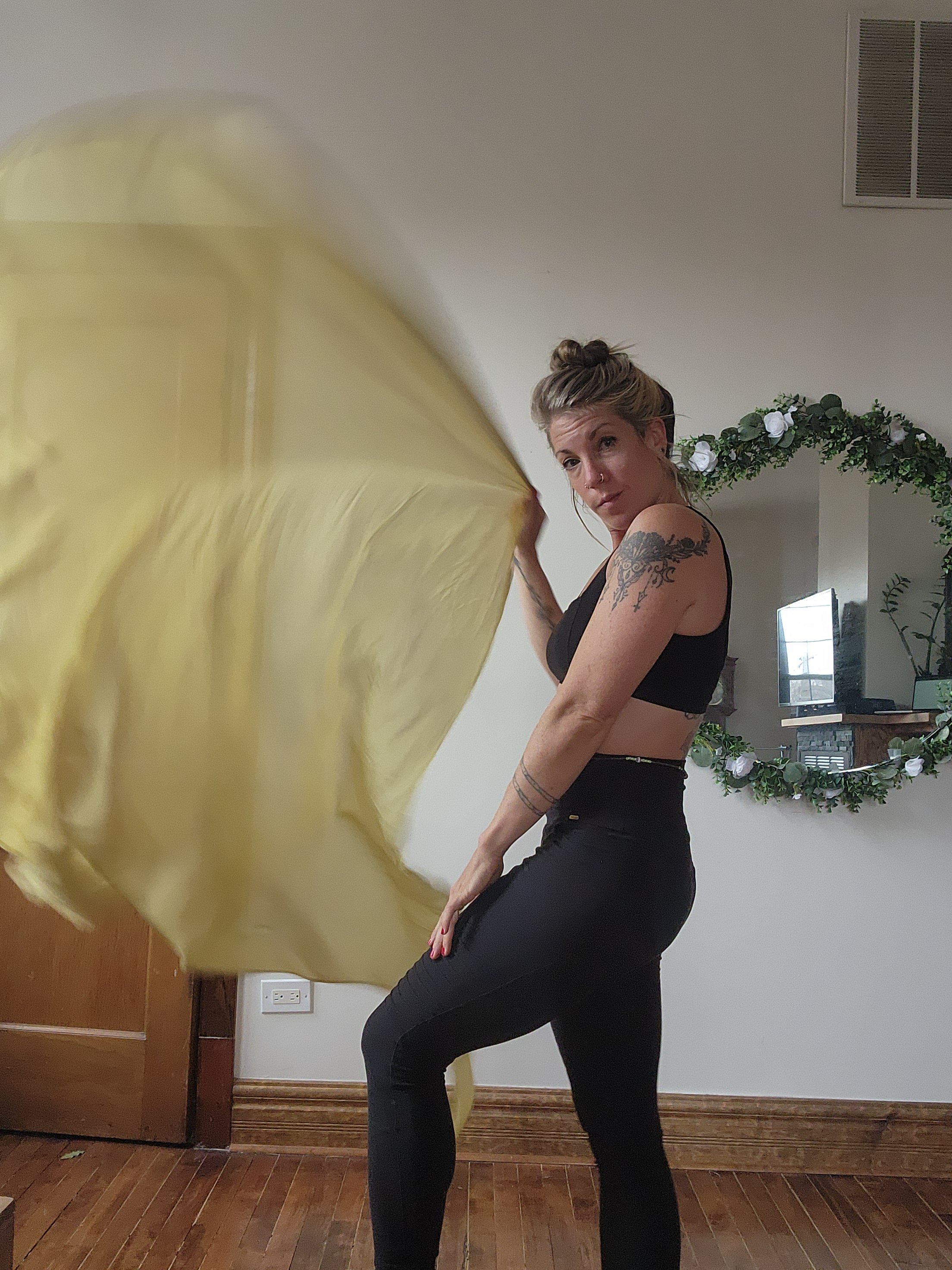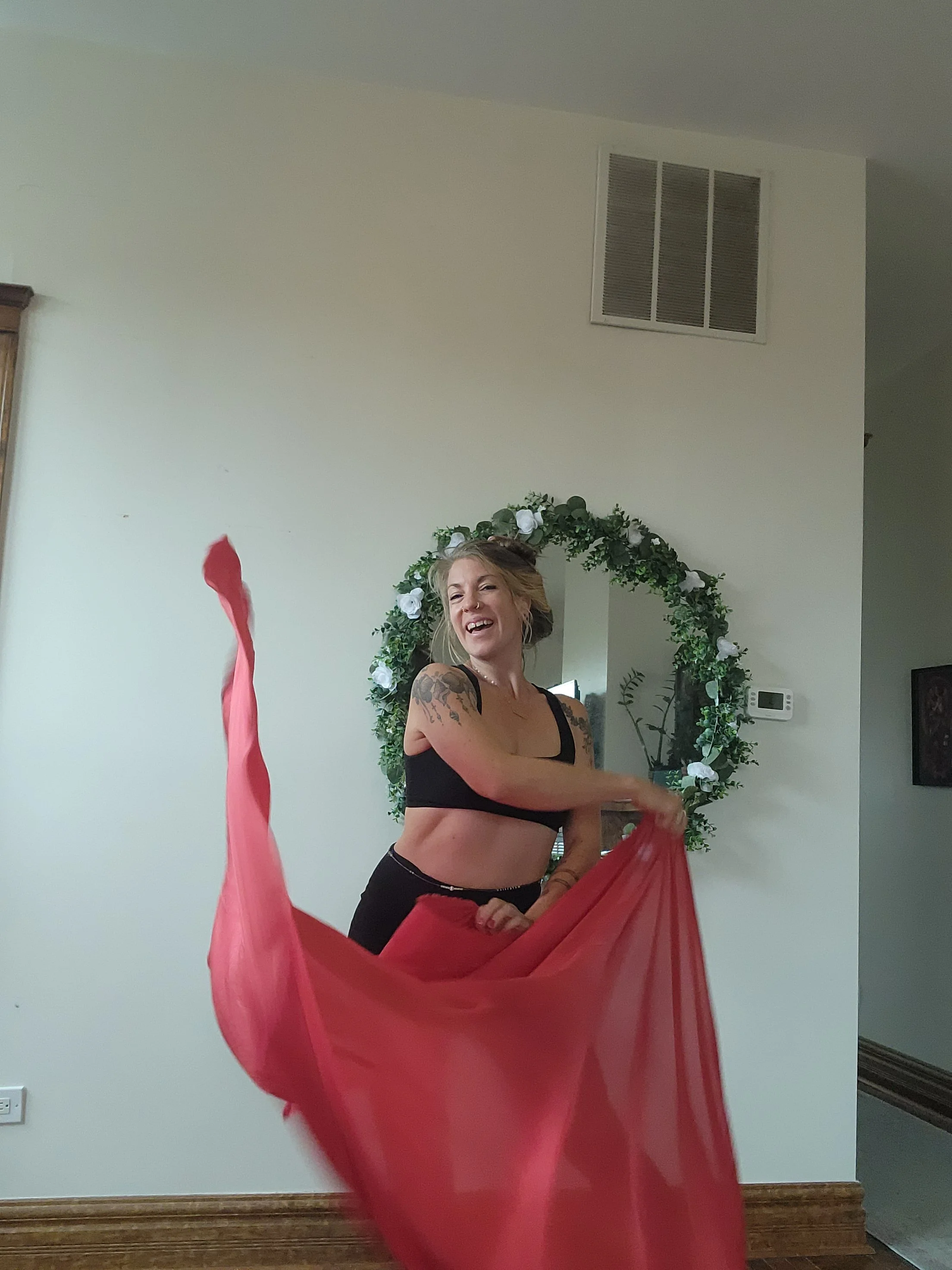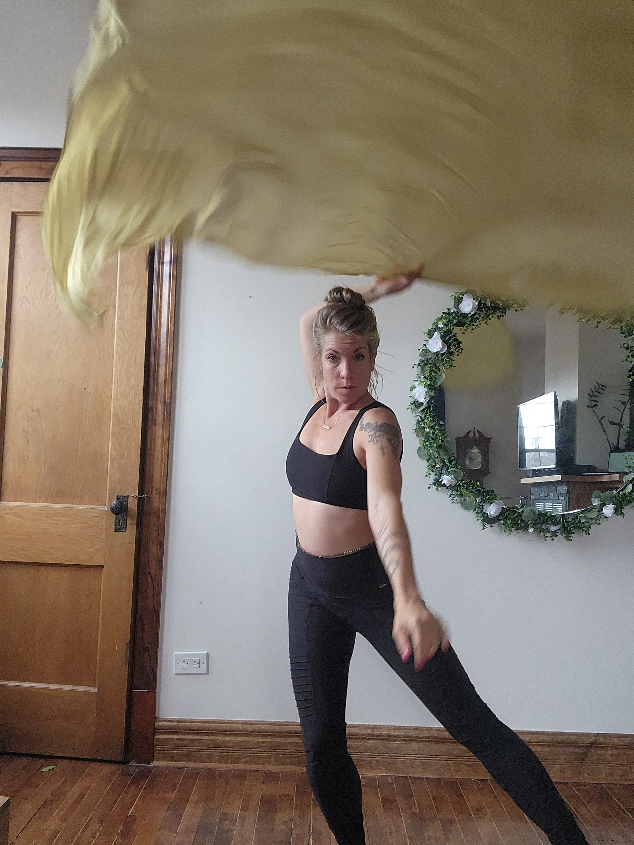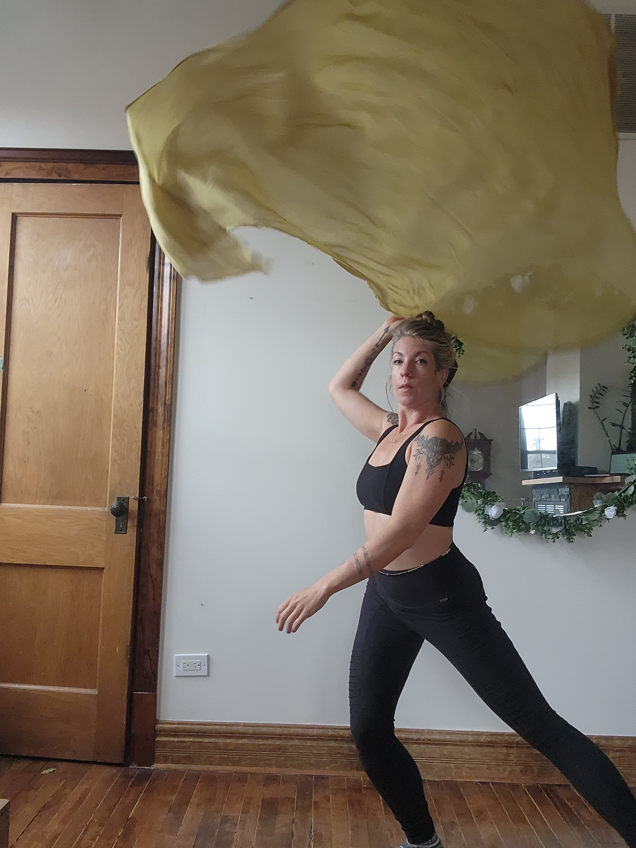 Each weighted silk veil is a unique art piece, created by Gaea Lady (assisted by Laine Bones). This style of ‘flow prop’ is designed to get you out of your head and into your body by enveloping both dancer and viewers in high quality Chinese silk. It is accessible to beginners, yet offers complexity for years and years of devoted explorations & refinement. The weighted edge ‘leads’ the rest of the veil, offering more direction than just a silk veil itself. A whole flow-losophy has emerged out of Gaea’s experience with this prop, and she teaches online via classes & tours sharing it. Versatile: costume, garment, skirt, cape, wrap ; as a decorative element in the home ; and as flow prop that can be used in a myriad of ways. (This design is the product of 10+ years of development and refinement by Gaea herself, please do not replicate without permission! )