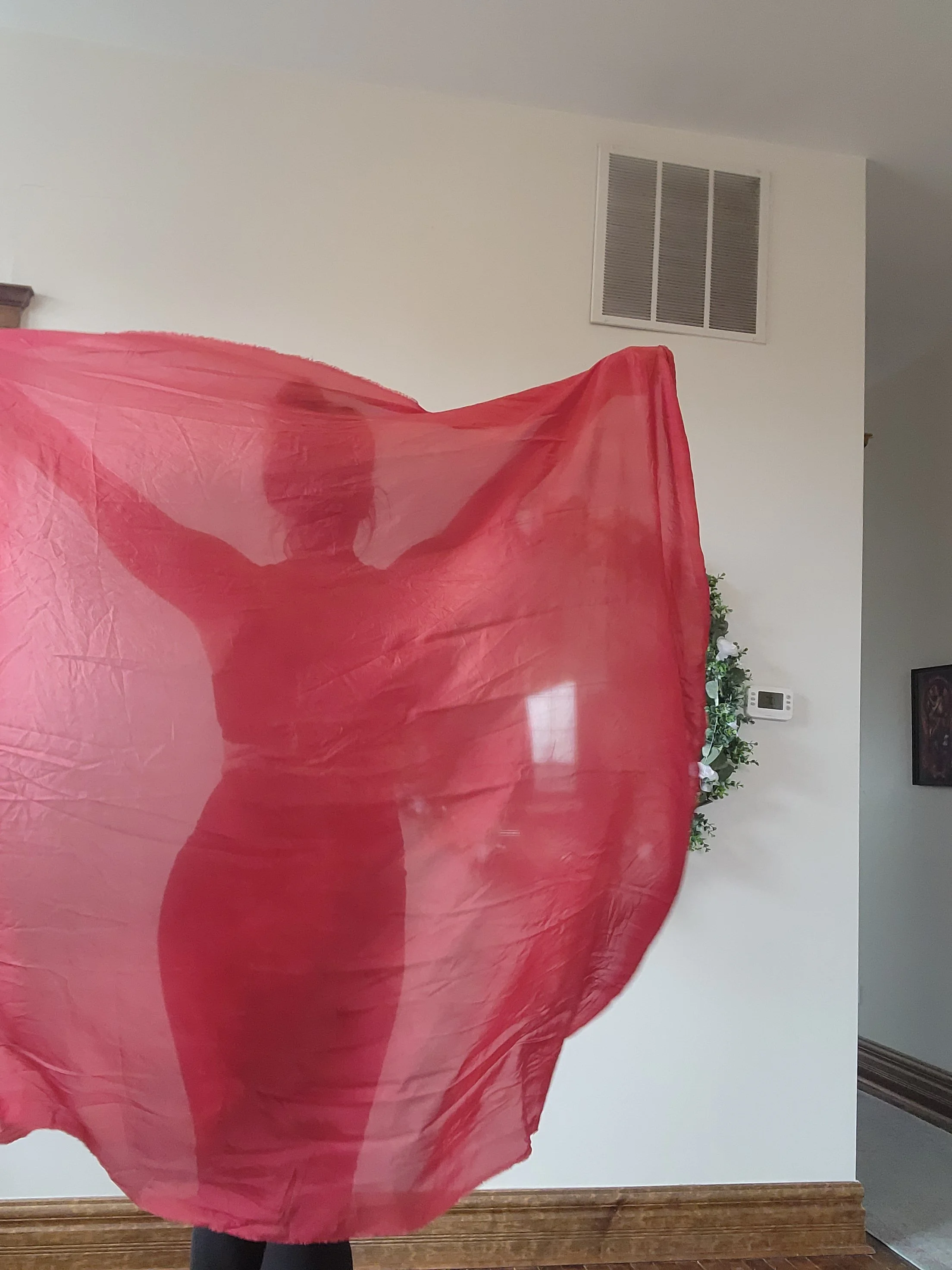 Movement : This medium style veil is the best of both worlds - it’s large enough to mostly wrap most bodies & small enough to avoid the tangles of large veils in small spaces. These tend to be easier for beginners starting their flow journey, yet large enough to create big flow impact that many want in a veil dance. If held close to the weighted tip, one can get a lot of inner rotation work in, or if held far a very big throw for big spaces.