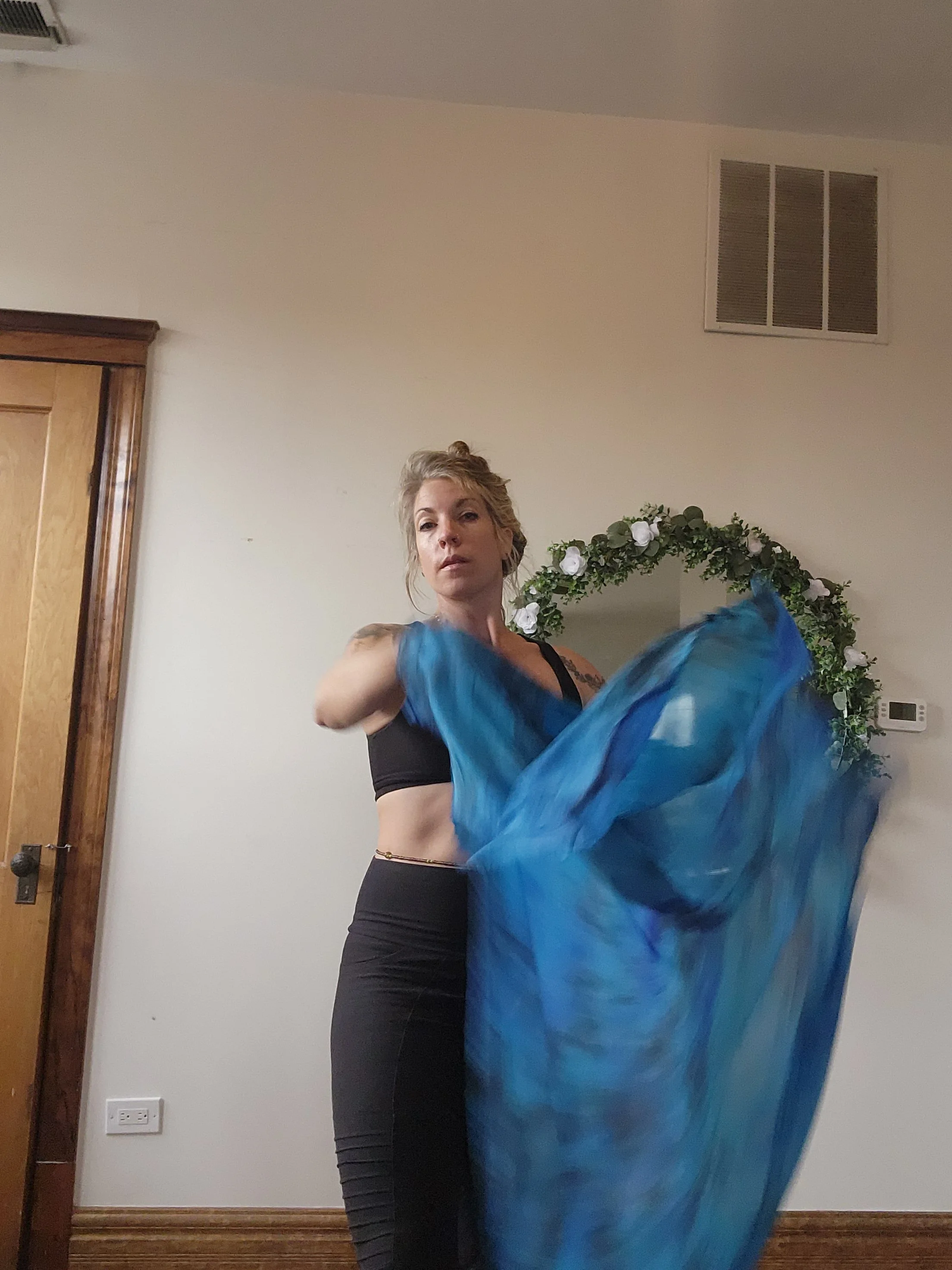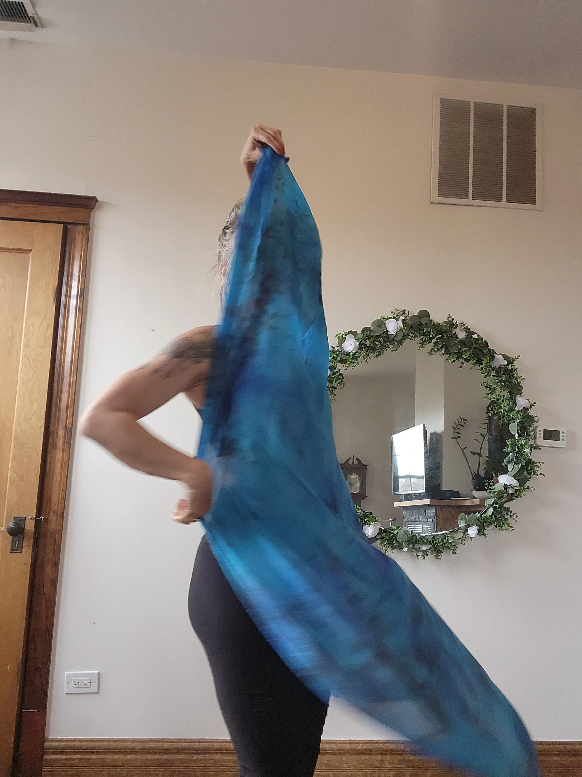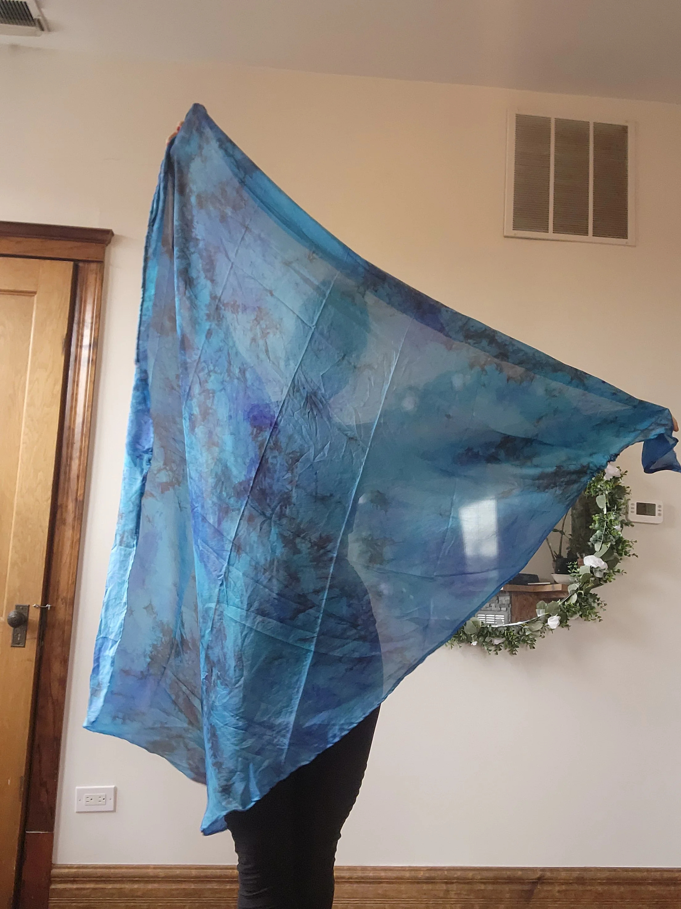 Each weighted silk veil is a unique art piece, created by Gaea Lady (assisted by Laine Bones). This style of ‘flow prop’ is designed to get you out of your head and into your body by enveloping both dancer and viewers in high quality Chinese silk. It is accessible to beginners, yet offers complexity for years and years of devoted explorations & refinement. The weighted edge ‘leads’ the rest of the veil, offering more direction than just a silk veil itself. A whole flow-losophy has emerged out of Gaea’s experience with this prop, and she teaches online via classes & tours sharing it. Versatile: costume, garment, skirt, cape, wrap ; as a decorative element in the home ; and as flow prop that can be used in a myriad of ways. (This design is the product of 10+ years of development and refinement by Gaea herself, please do not replicate without permission! )