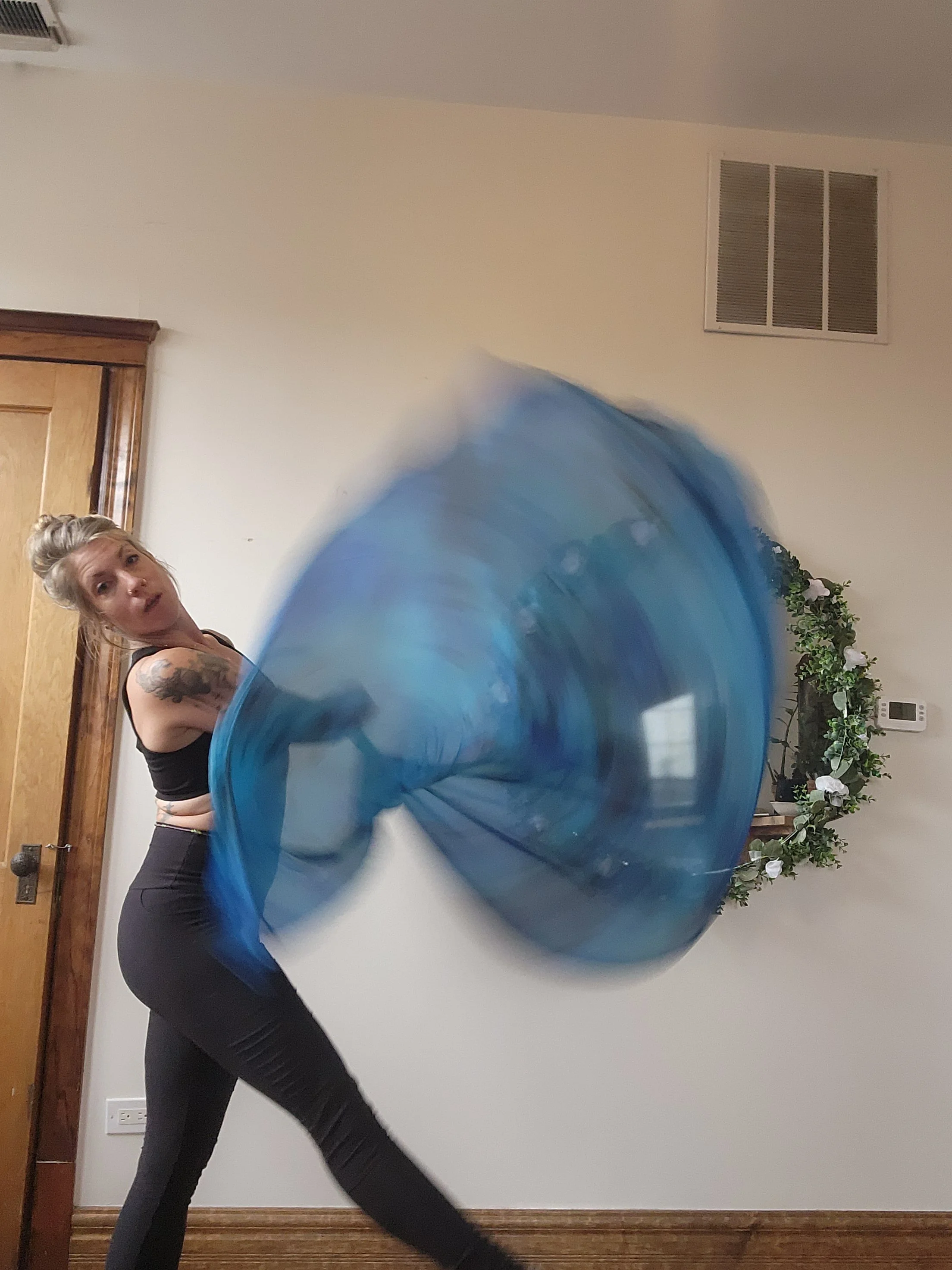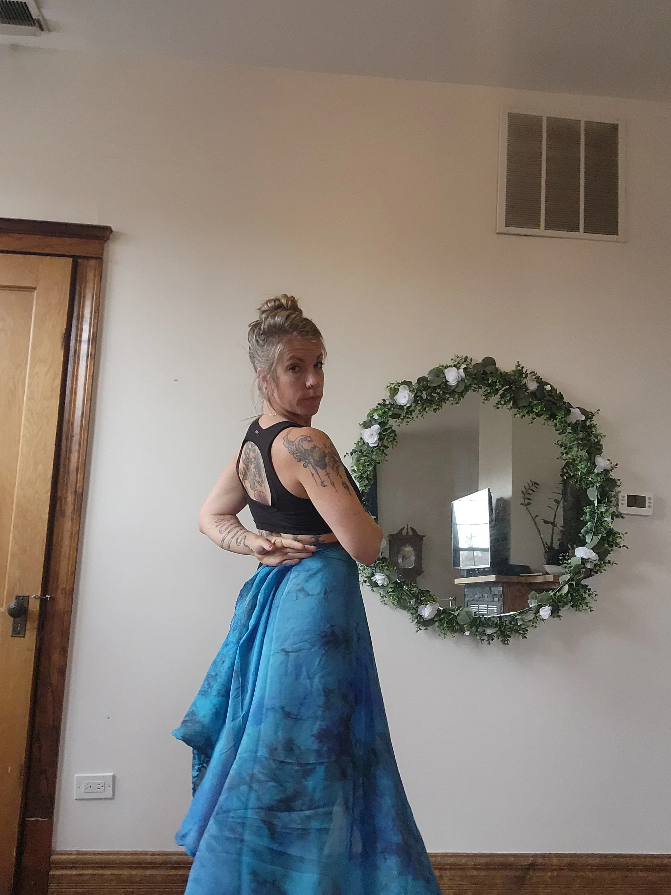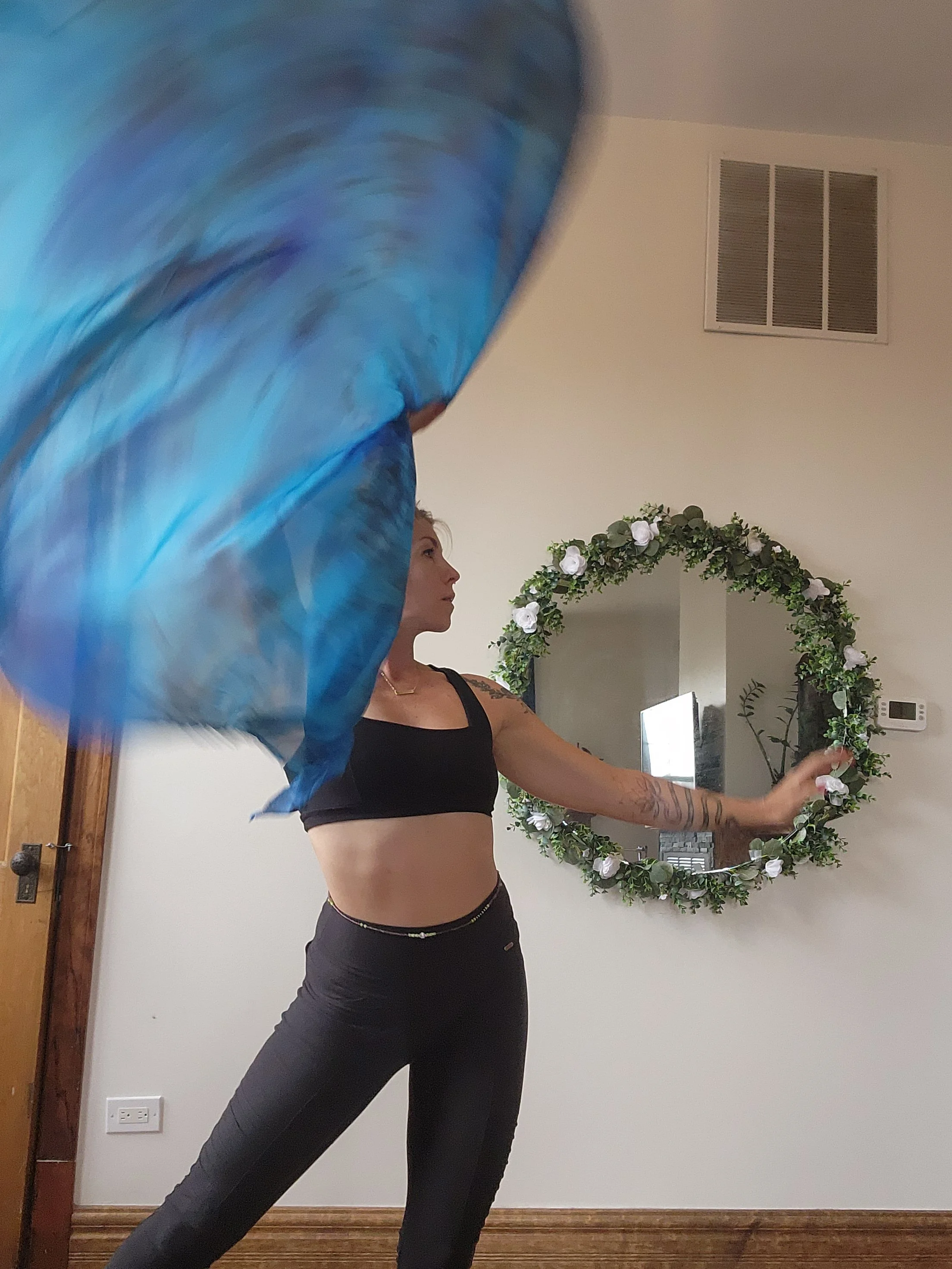 Each weighted silk veil is a unique art piece, created by Gaea Lady (assisted by Laine Bones). This style of ‘flow prop’ is designed to get you out of your head and into your body by enveloping both dancer and viewers in high quality Chinese silk. It is accessible to beginners, yet offers complexity for years and years of devoted explorations & refinement. The weighted edge ‘leads’ the rest of the veil, offering more direction than just a silk veil itself. A whole flow-losophy has emerged out of Gaea’s experience with this prop, and she teaches online via classes & tours sharing it. Versatile: costume, garment, skirt, cape, wrap ; as a decorative element in the home ; and as flow prop that can be used in a myriad of ways. (This design is the product of 10+ years of development and refinement by Gaea herself, please do not replicate without permission! )