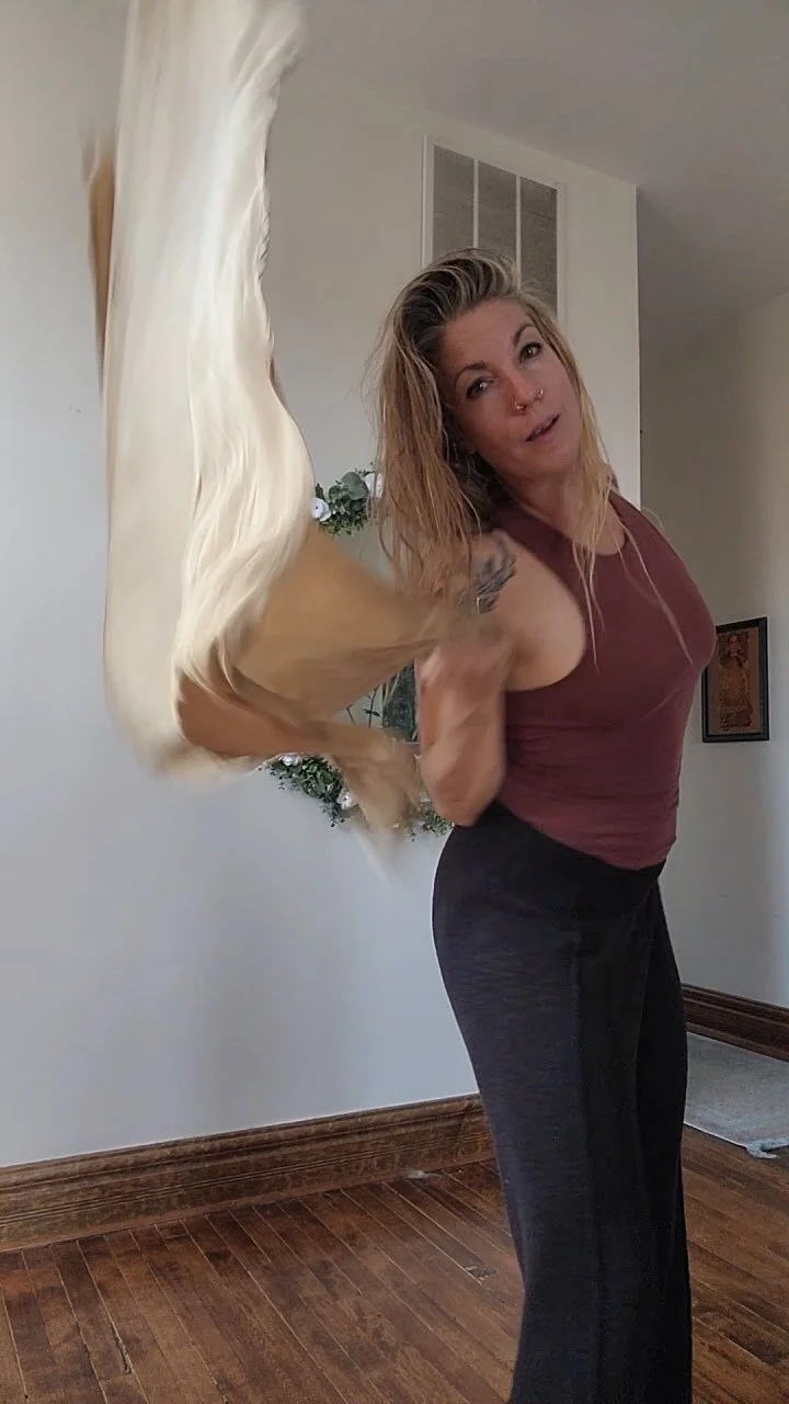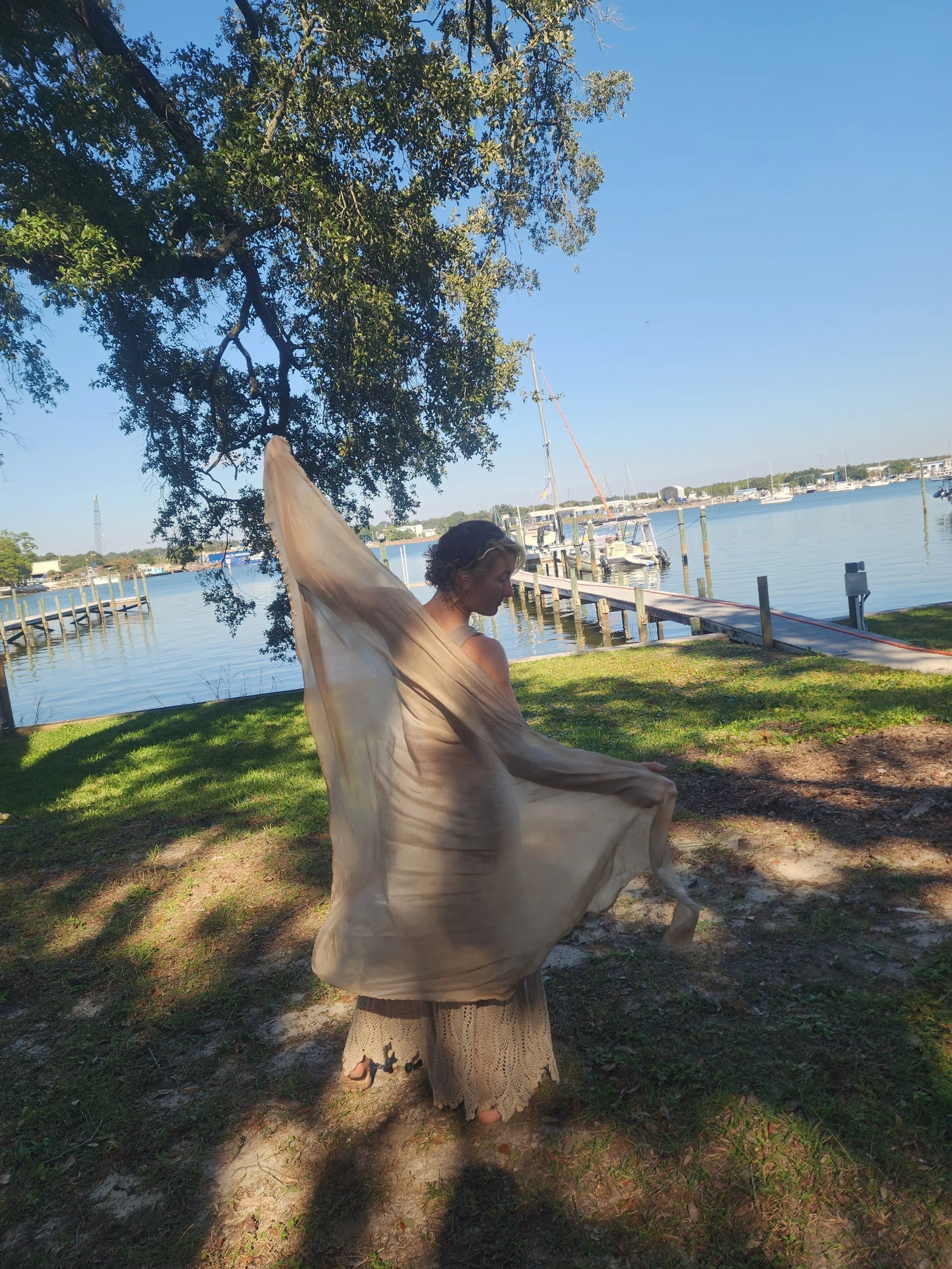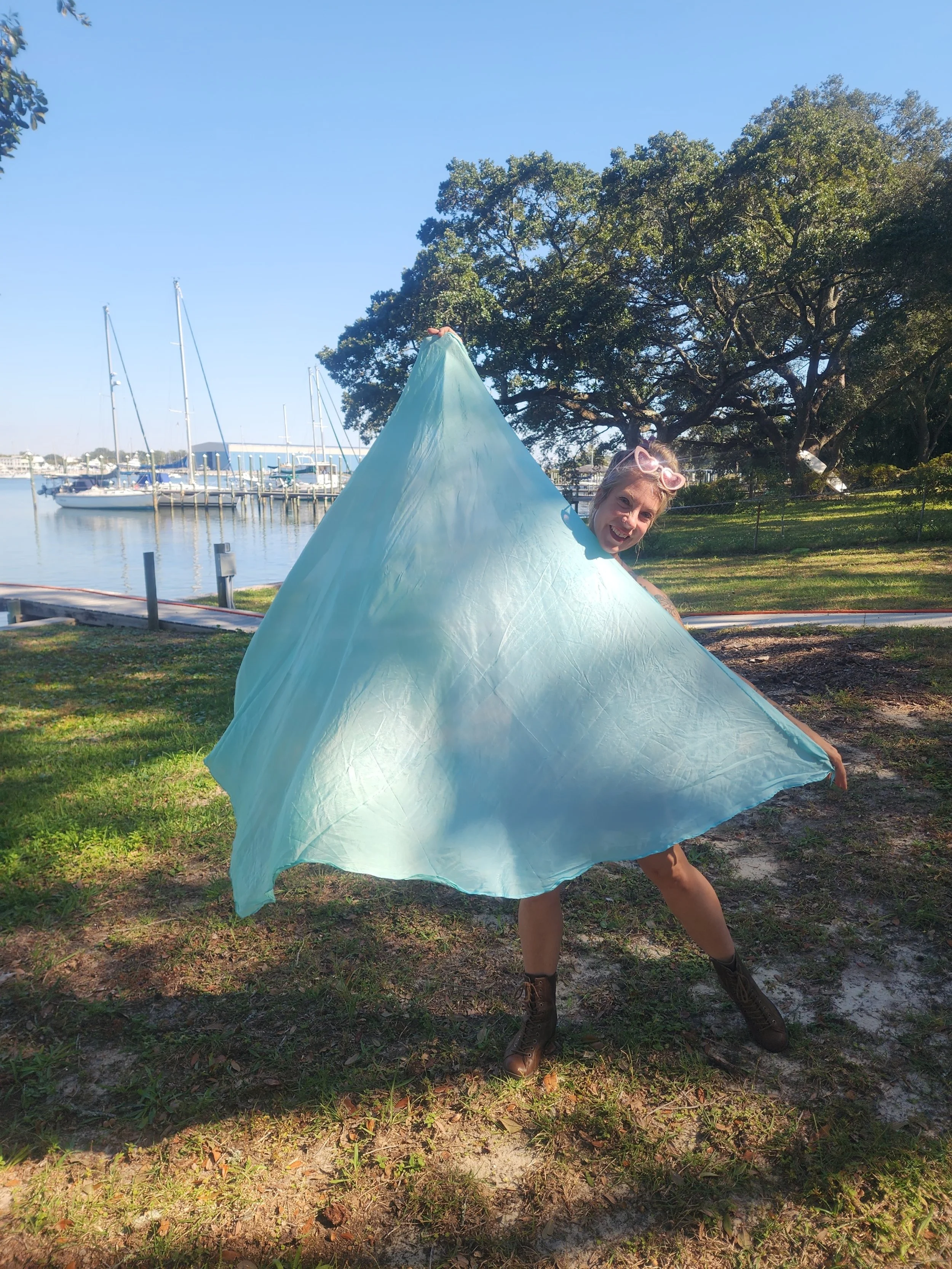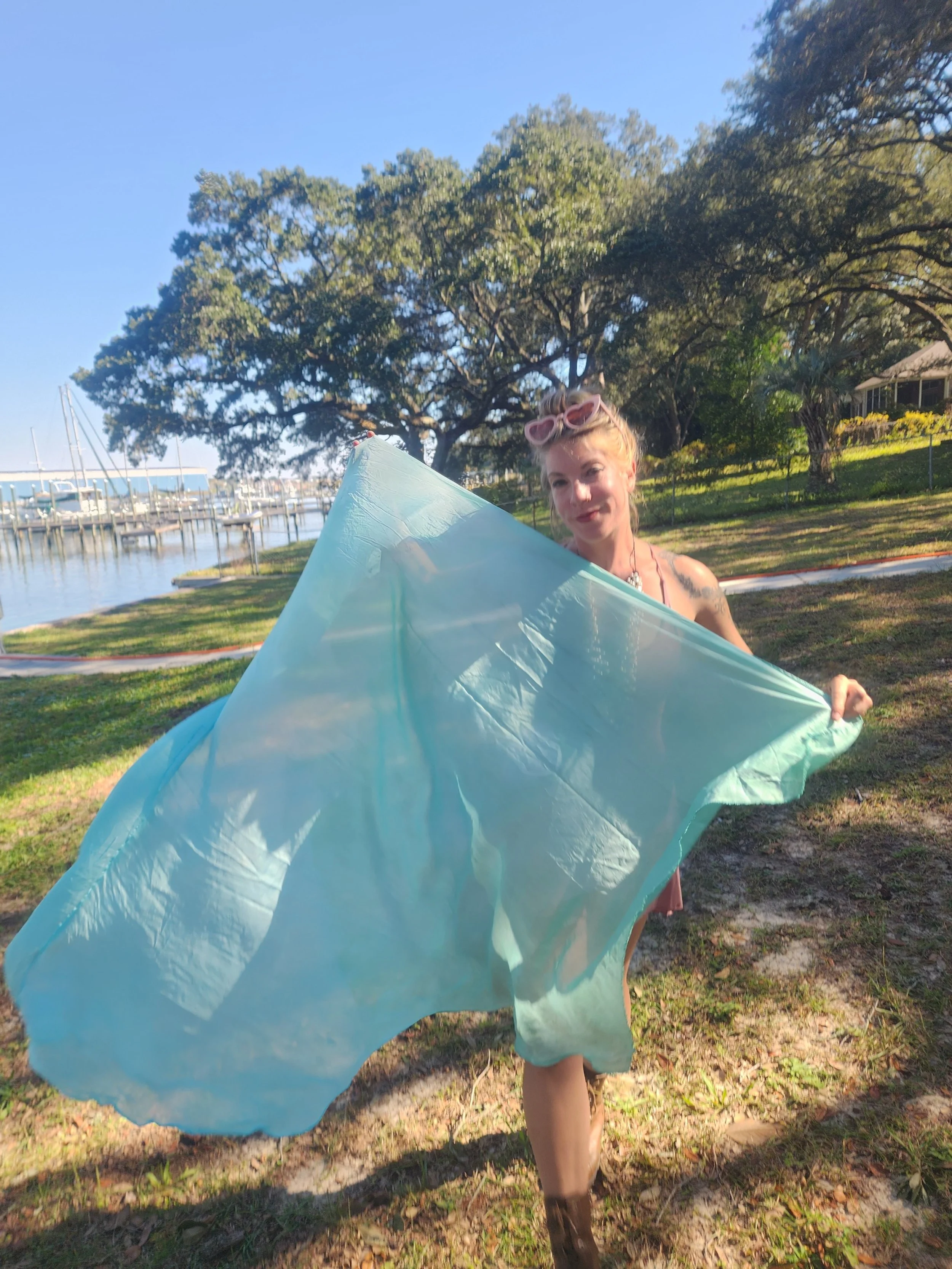 Movement : This small style veil is also known as a “flag”. It’s a fast moving technical dream, small to avoid the tangles of large veils in small spaces. These tend to be easier for beginners starting their flow journey, and are great to use dual handed for a brain expanding flow. Small veils are tuckable, travel-able, and super fun for a fast-paced flow.